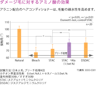 皮膚中のNMF成分(Natural Moisturizing Factor 天然保湿因子)が、角層の保湿に重要な役割を果たしているのに対し、毛髪中に存在するアミノ酸と、その役割に関する報告例は多くはありません。しかし、様々なアミノ酸を毛髪に補給することで、保湿、強度改善、ヘアカラーの色落ち防止、ダメージ修復などに効果があることが知られております。